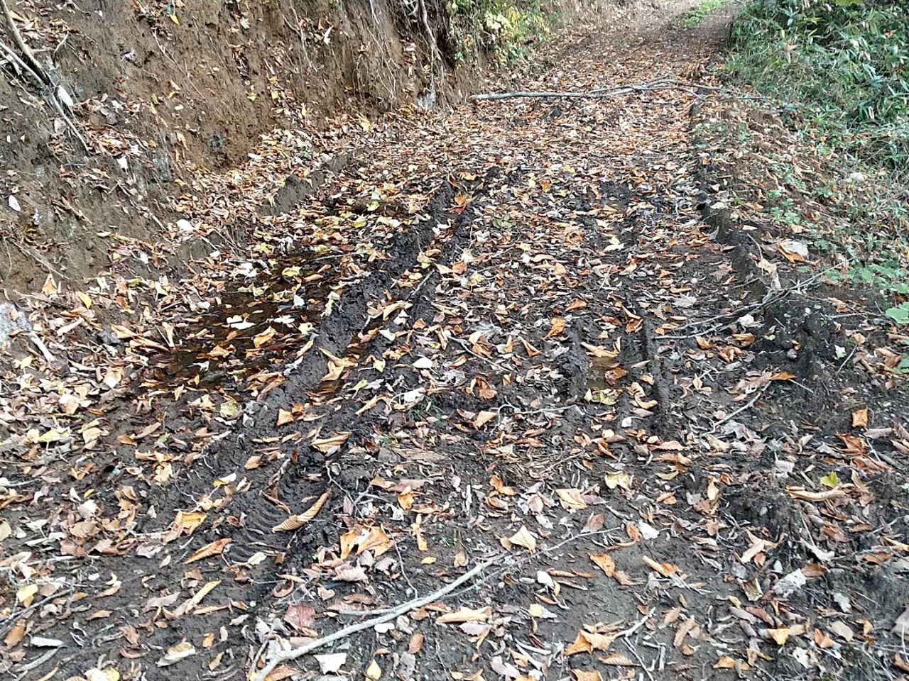 柔らかい泥でコケたので、大きなケガはありませんでしたが、躰のアチコチが痛いのと、日没直前だったので、今日の林道探索は終了。