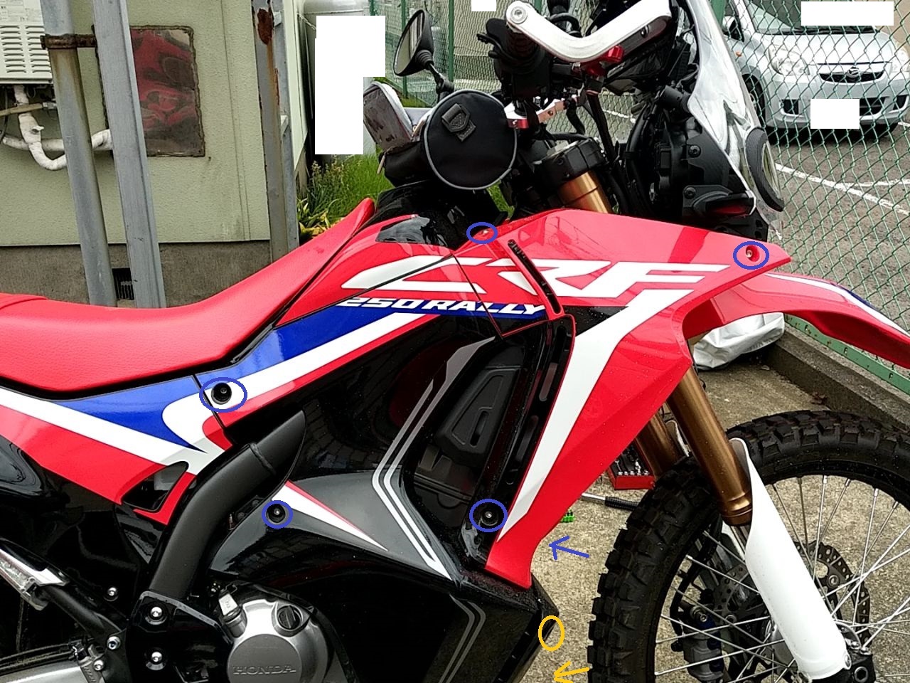 なお、黄色丸と黄矢印のアンダーカウルを止めているボルトも外しておくと、簡単に外れる。そしてここにトラップがある。