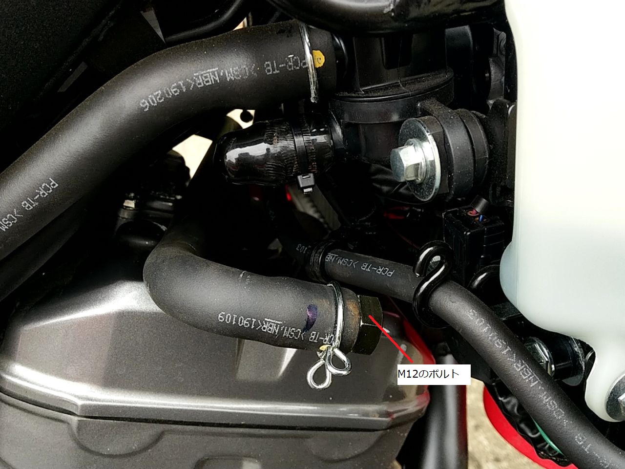 最後に、外したホースがプラプラするので、元々使われていたホースバンドの穴にインシュロックを通して、上側のホースと適当に止めた。