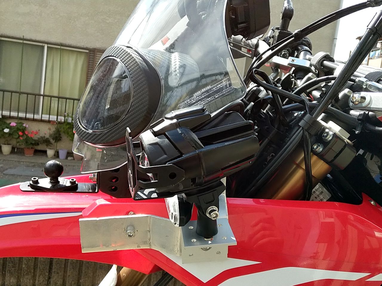 CRF250RALLYはオフ車である以上、低速域でラジエタの導風率が低くてもきちんと冷却してくれるはず(実際、8の字練習してると頻繁に冷却ファンが回った)だが、余り気持ちの良いものではない。という事で、フロントの太めのハーネス類を保護する樹脂製のカバーにボルトを通して、そこにΦ25のアルミパイプを止める作戦にした。