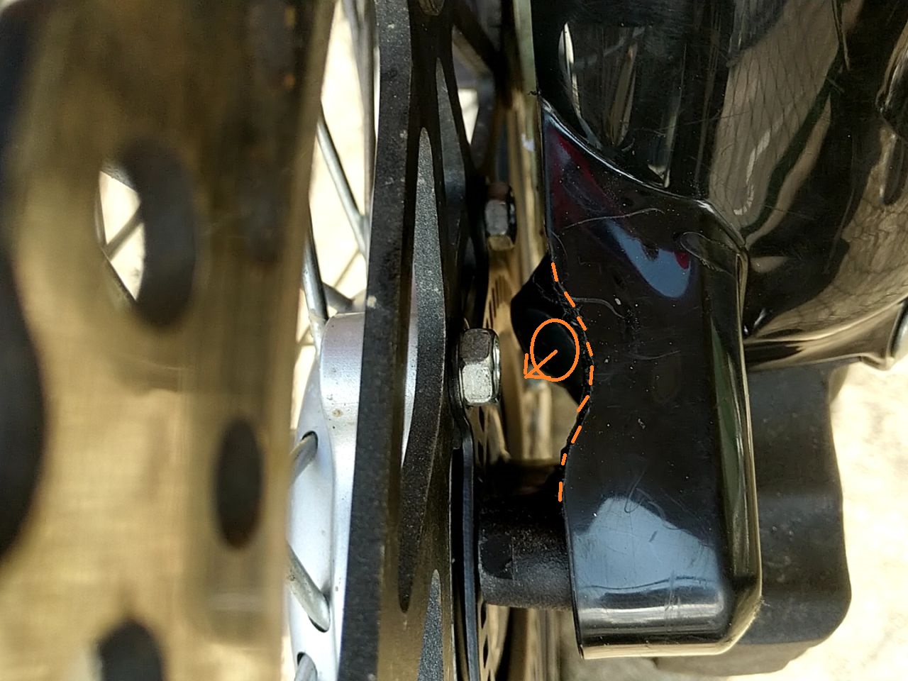 プロテクタを交換した後に撮影したので、モノが黒になっているが、基本的なカメラ向きは同じ。オレンジ円がボルト頭で、点線がプロテクタをかっ飛ばした所。