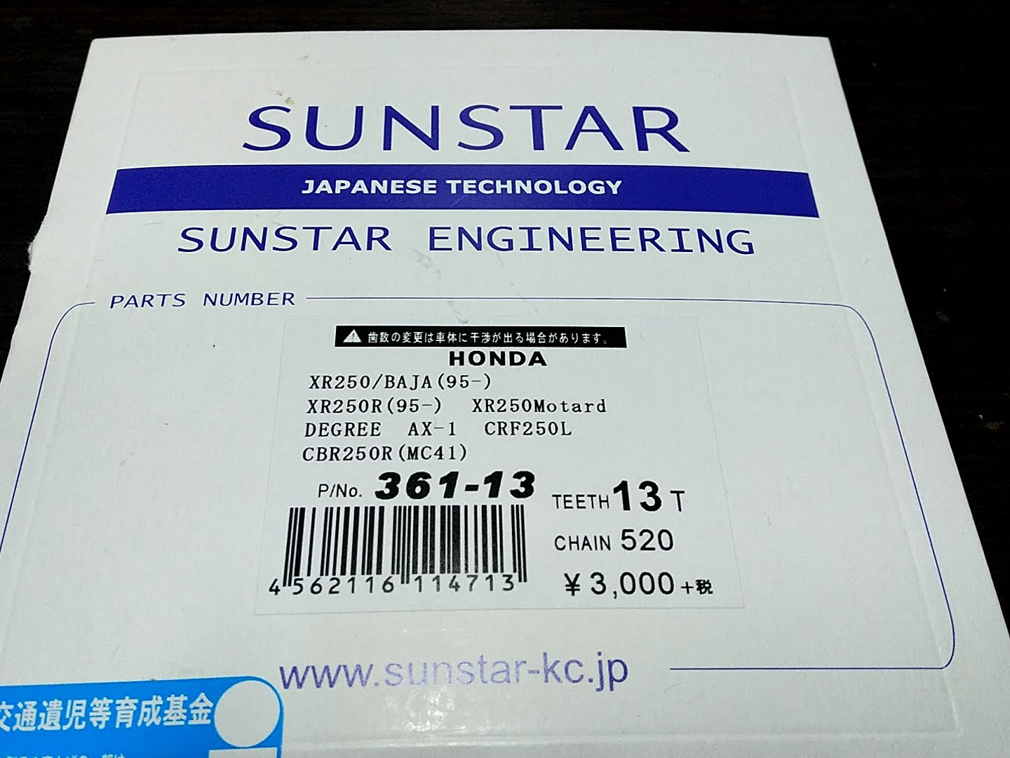 北海道遠征の際、往復の高速道路で、経済速度巡航をしてたのは燃費の悪さだけではなかったんだ。 ハンドルにインナウェイト装着にも書いたけど、振動が酷くて速度を上げる気になら無かったというのもある。 それで少しでも振動が少ない回転数で走れる事を期待して、15丁のスプロケを先に入手していたのだ。まぁ15丁は買ってあるけど、どうも本命は13丁の方じゃないか?と感じたため、だったらいっその事、±1丁ずつ買って試してみれば、はっきりするだろうという作戦だ。