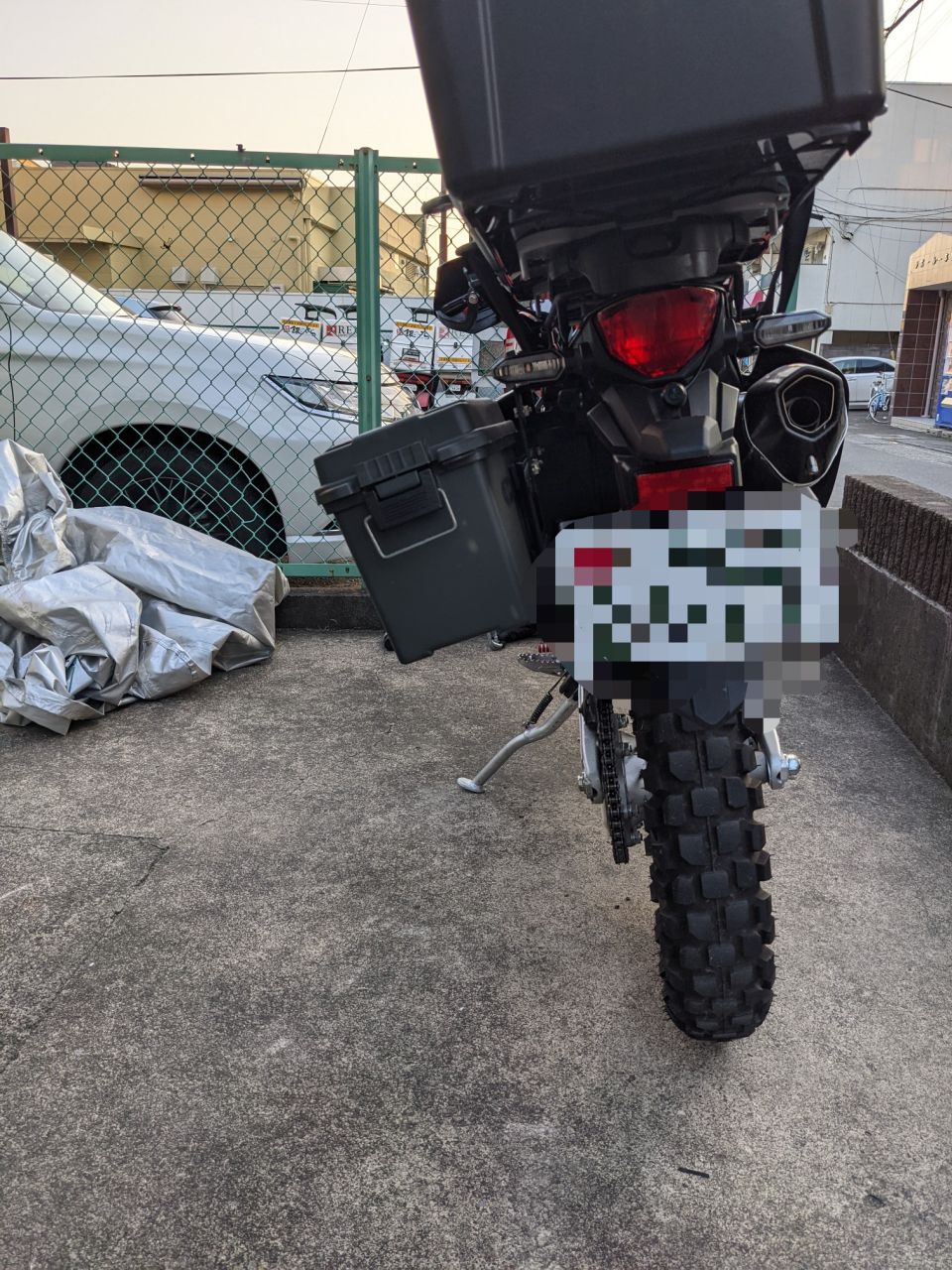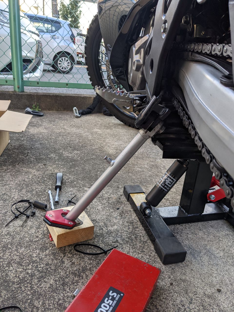 結局、足で車体抑えつつ背筋全力で引っ張って、なんとか付けることができた。