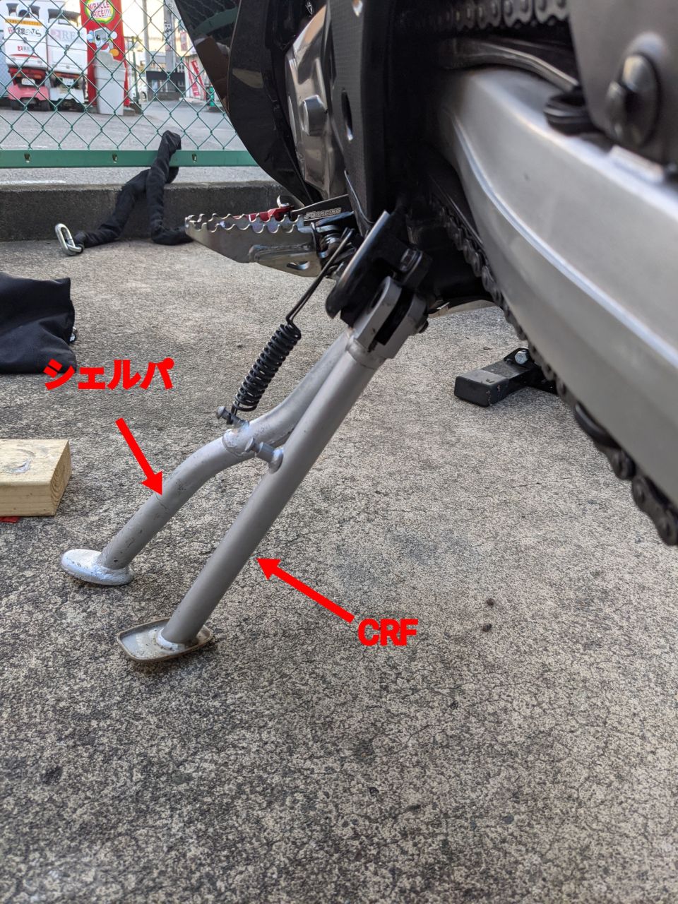 2chのCRF250RALLYスレで、「シェルパのスタンドに交換すると良い感じ」という話題が出て、うpされた画像が良い感じだったので、パクる事にした。